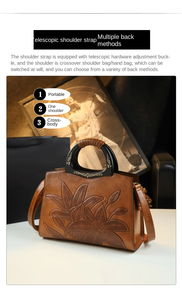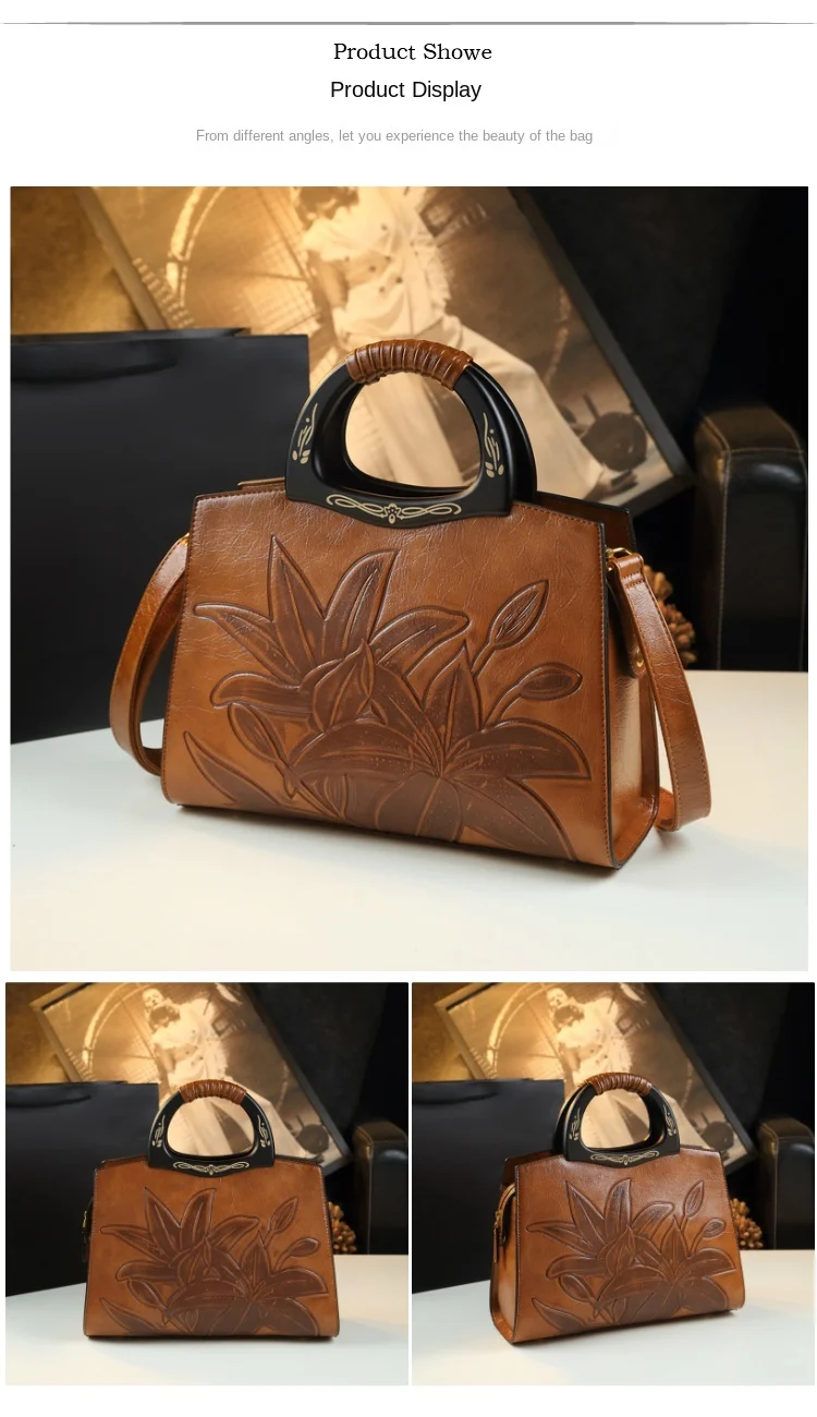 Retro Genuine Leather Women's Handbags Fashion All-Match Mom Shoulder Crossbody Bag Lady Flower Portbale Top Handle Bags